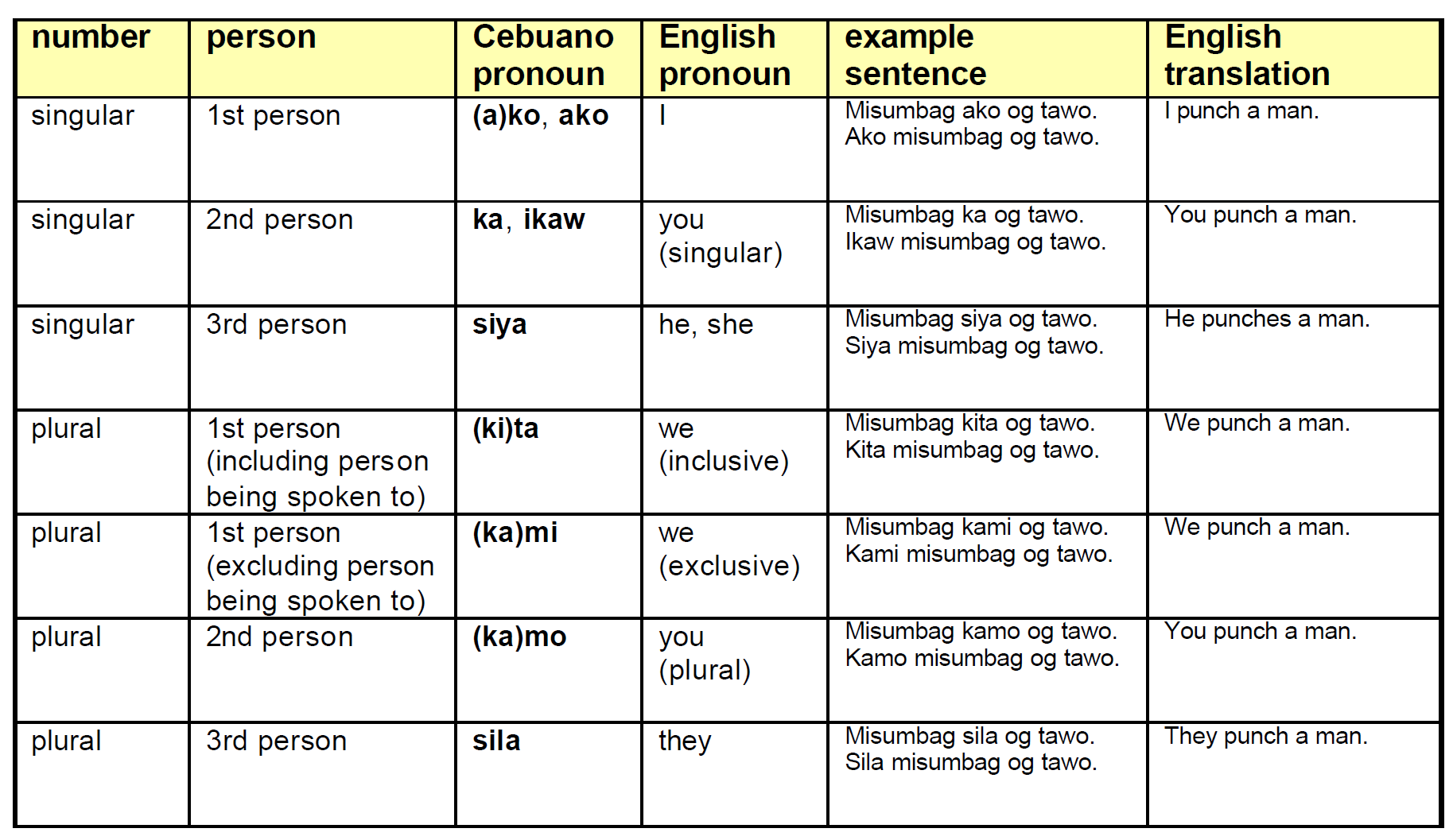 | 1 | ability to | present/past | maka | Tuon ( teach/study ) | Makatuon siyag Binisaya | He can teach Visaya |